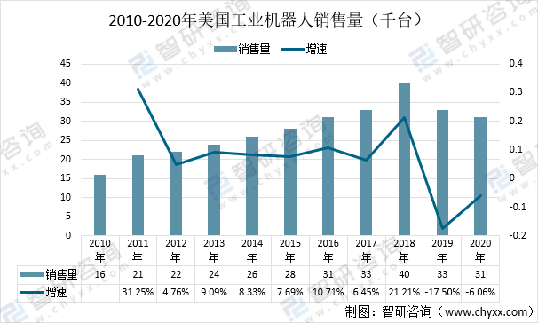 美國工業機器人受中美貿易戰這兩年在持續下降,2020年美國工業機器人銷售量為3千臺相比2019年下降了6.06%。