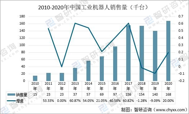 2020年中國工業機器人銷售量為168千臺,相比2019年銷售量的140千臺增加了28千臺,同比增長了20%。