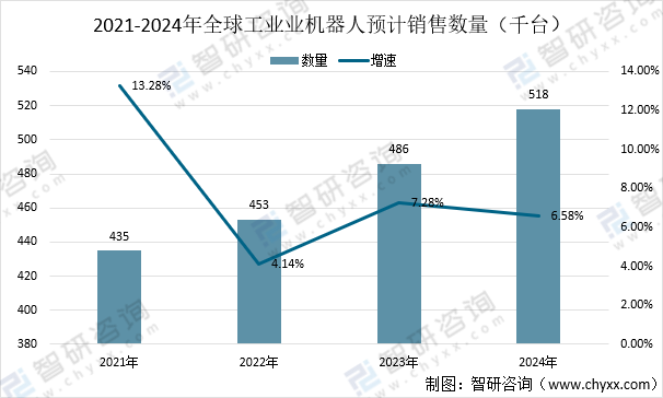 2021-2024年全球工業業機器人預計銷售數量(千臺)