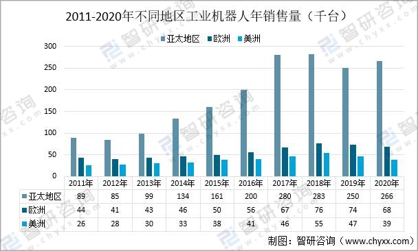 2011-2020年不同地區工業機器人年銷售量(千臺)