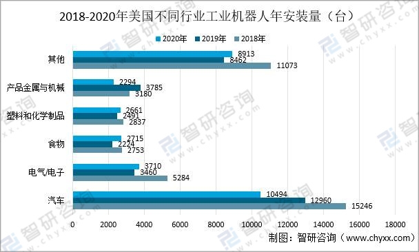美國工業機器人主要應用在電氣/電子、汽車、金屬與機械、塑料和化學制品和食物等方面,主要運用在汽車方面。2020年汽車行業銷售量為10494臺。