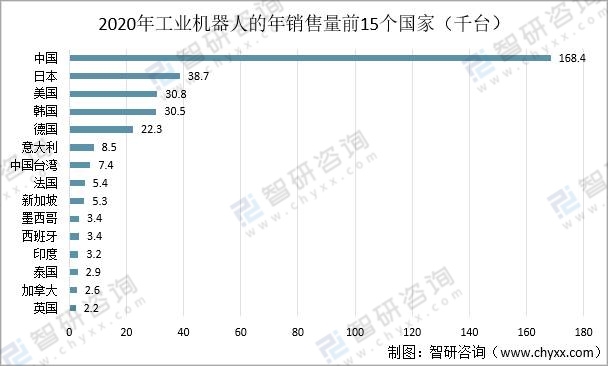 從2020年工業機器人的銷售情況可以看出,工業機器人主要分布在中國、日本、美國、韓國和德國。其中,中國的工業機器人年銷售量處于領先地位。2020年中國的銷售量為168.4千臺,占比全年總銷售量的43.85%。日本、美國、韓國、德國分別為38.7千臺、30.8千臺、30.5千臺、22.3千臺。