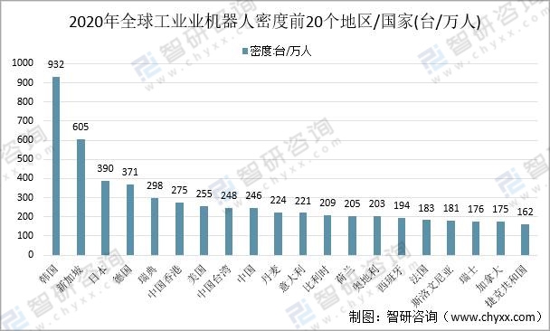 從工業機器人密度來看,韓國工業機器人密度最高,2020年韓國工業機器人密度為932臺/萬人。