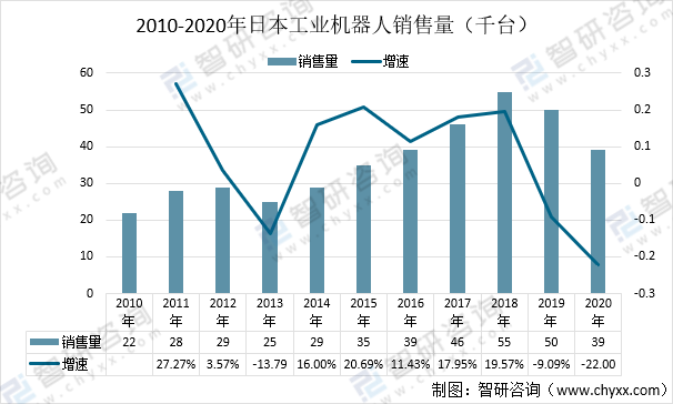 日本工業機器人受經濟影響這兩年在持續下降,2020年日本工業機器人銷售量為39千臺相比2019年下降了22%。