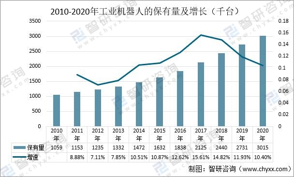根據國際機器人聯合會數據顯示:近十年,工業機器人的保有量在持續上漲。2020年的保有量為3015千臺,相比2019年的2731千臺增長了10.4%。