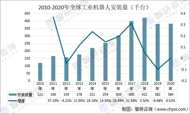 2010-2020年全球工業機器人安裝量(千臺)