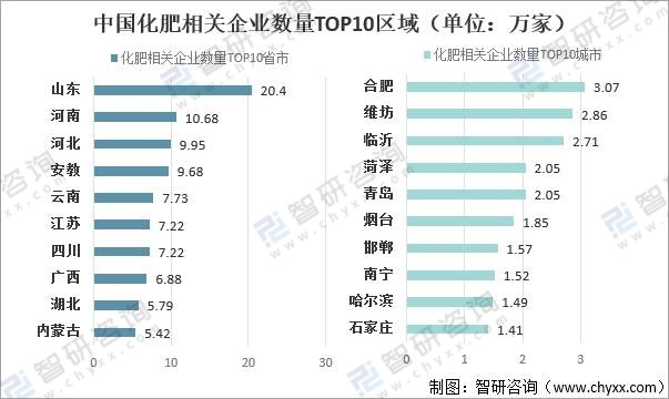 我國化肥相關企業TOP10省市及TOP10城市