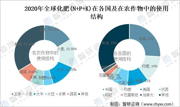 2020年全球化肥(N+P+K)在各國及在農作物中的使用結構
