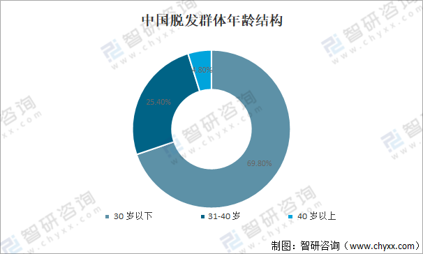 據統計,中國脫發群體中30歲以下占到69.8%;31-40歲占25.4%40歲以上僅占4.8%,可以看出目前80、90后已經成為中國脫發人群的主力軍,脫發年輕化趨勢明顯。中國脫發人群最小年齡僅為16歲,平均年齡30.1歲。