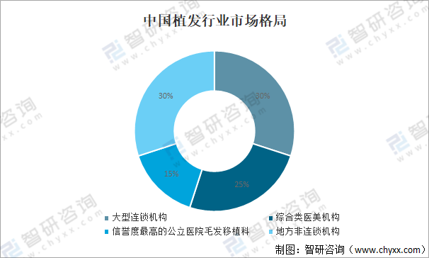 近年來,越來越多的植發企業不斷加入不斷發展,根據《2021中國植發行業報告,目前的毛發移植機構大致可以分成四類,大型連鎖機構、綜合類醫美機構、信譽度最高的公立醫院毛發移植科、地方非連鎖機構,市場占比分別為30%、25%、15%、30%。