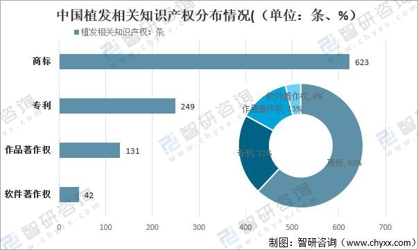 無論國家還是企業,先進技術始終是支撐其發展的重要源泉,科技的發展將進一步推動植發行業的擴展升級。植發是通過毛發移植技術,將人的頭皮毛囊進行“搬家”,在社會發展的驅動下,醫學技術已經成為其存在的核心競爭力。從企查查數據來看,與植發相關的知識產權共計1000余條,其中商標信息共623條,占比達62%;專利共249條,占總體的21%,作品著作權131條,占13%;軟件著作權42條,占4%。