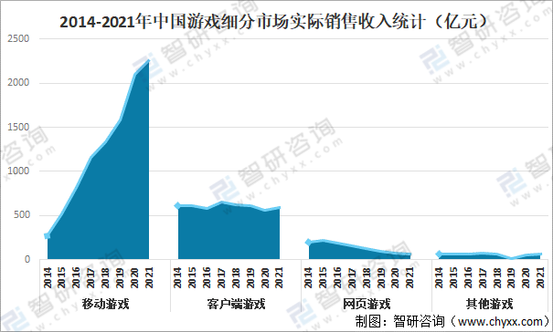 2014-2021年中國游戲細分市場實際銷售收入統計(億元)