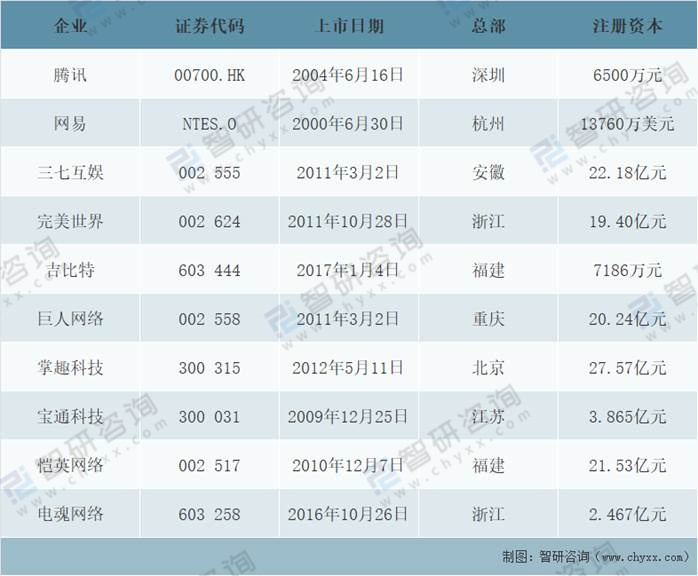 經過多年的發展,中國游戲企業遍地開花,一大批優秀的游戲企業迅速崛起,逐漸成為游戲行業中的翹楚,如騰訊、網易、三七互娛、完美世界、吉比特、巨人網絡、掌趣科技、寶通科技、愷英網絡、電魂網絡等,從上市時間來看,網易上市時間要早于騰訊、三七互娛、完美世界、吉比特、巨人網絡、掌趣科技、寶通科技、愷英網絡和電魂網絡。