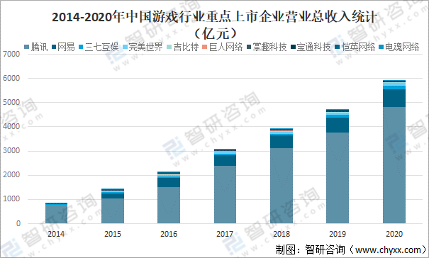 2014-2020年中國游戲行業重點上市企業營業總收入統計(億元)