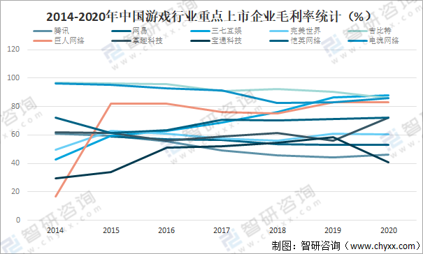 2014-2020年中國游戲行業重點上市企業毛利率統計(%)