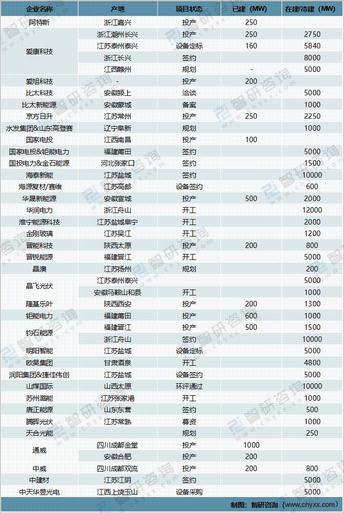 2021年中國(guó)HJT電池在建/待建產(chǎn)能