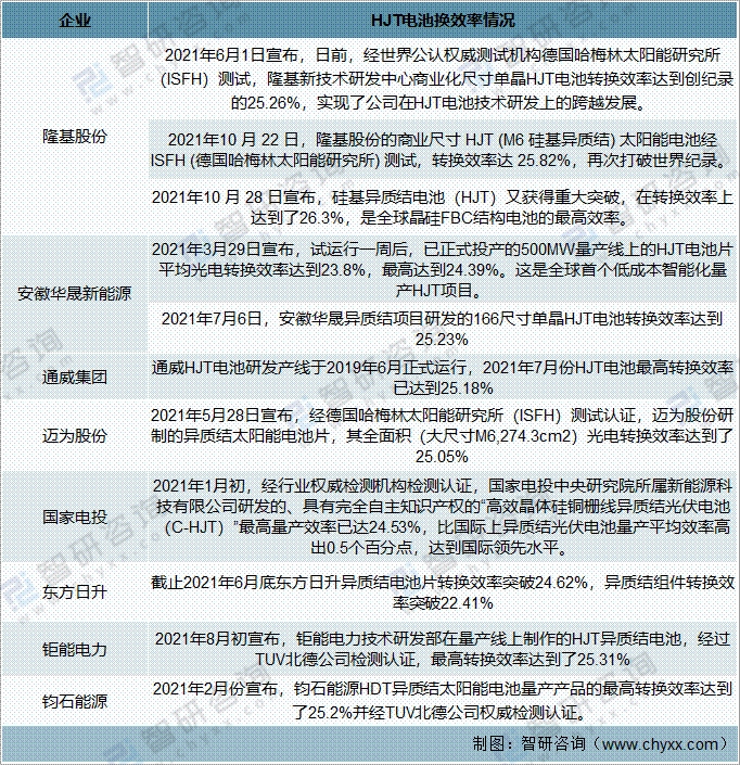 2021年中國(guó)HJT電池生產(chǎn)企業(yè)轉(zhuǎn)換效率
