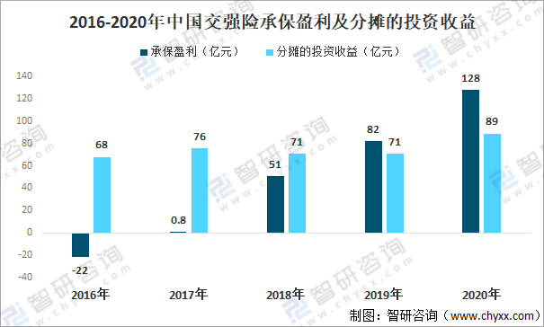 2016年中國交強險承保虧損為22億元,到2020年,中國交強險承保盈利達128億元,較上年增加了46億元;分攤的投資收益89億元,較上年增加了18億元。