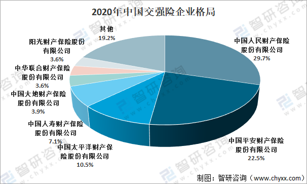 中國交強險市場份額主要集中在中國人民財產保險股份有限公司、中國平安財產保險股份有限公司,2020年合計占比52.2%,其中中國人民財產保險股份有限公司占比29.7%,中國平安財產保險股份有限公司占比22.5%;其次中國太平洋財產保險股份有限公司占比10.5%。
