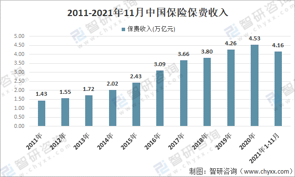 交強險作為保險重要細分之一。自2000年以來,在中國經濟高速增長,國民收入不斷提高,居民消費穩步增長的背景下,我國保險行業迅速成長, 2020年中國保險保費收入為4.53萬億元,2021年1-11月保險保費收入為4.16萬億元。