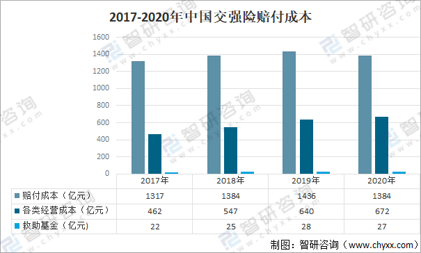2017-2019年中國交強險賠付成本不斷增多,2020年有所下降,2020年賠付成本為1384億元,較2019年減少了52億元;各類經營成本672億元(含救助基金27億元),自救助基金制度實施以來,已累計提取244億元。