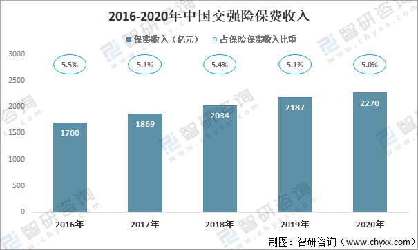 隨著我國機動車保有量的增長,中國交強險保費收入也逐年增加,根據中國銀行保險監督管理委員會數據:中國交強險保費收入由2016年的1700億元增加至2020年的2270億元,年復合增長率為7.5%,保障金額43萬億。