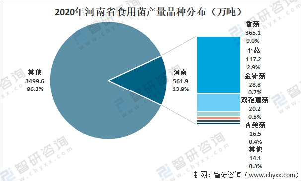 在河南自然資源、生產成本的優勢,以及相關政策和科研創新的推動下,河南省成為了中國最大的食用菌生產省,2020年產量占全國總產量的13.8%,其中全省香菇產量為365.1萬噸,平菇產量為117.2萬噸。