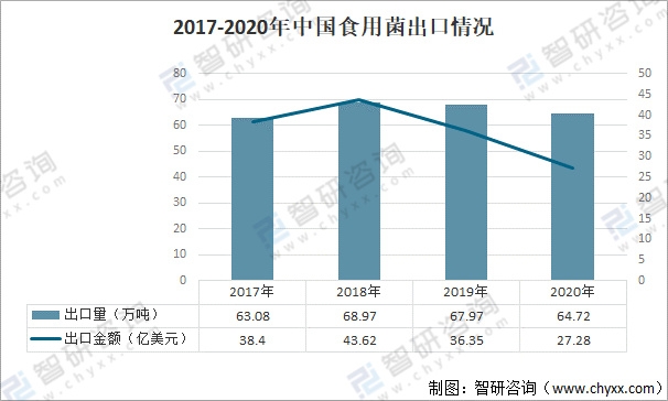 2020年主要受疫情影響,中國食用菌出口量有所下降,出口量為64.72萬噸,出口金額為27.28億美元,較2019年分別下降4.8%、25.0%。