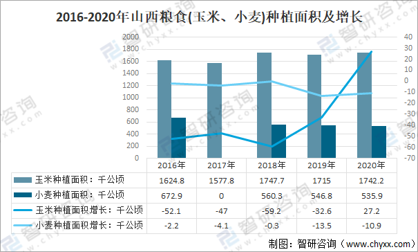 2016-2020年山西糧食(玉米、小麥)種植面積及增長