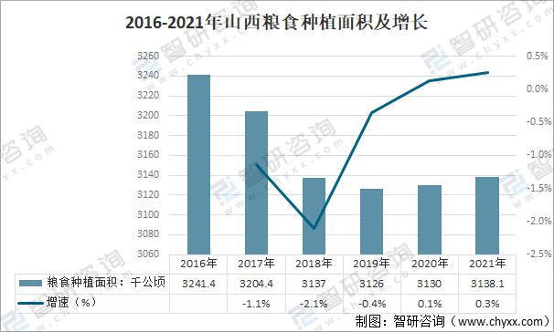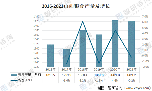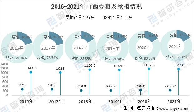 2021年年山西遭遇自然災害,當地糧食生產造成一定影響,尤其給秋收帶來了困難,2021年山西省糧食產量1421.2萬噸,較2020年減少3.1萬噸;因山西夏糧獲豐收,夏糧總產量為243.37萬噸,比上年增加6.58萬噸,增長2.78%;山西秋糧1177.8萬噸,較2020年減少9.7萬噸。