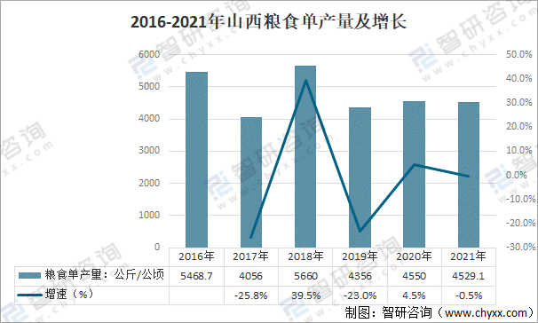 從糧食單產量來看,2020年山西糧食單產量4550公斤/公頃,較2020年增長194.公斤/公頃,同比增長4.5%;2021年山西糧食單產量4529.1公斤/公頃,較2020年減少20.9公斤/公頃,同比下降0.5%。