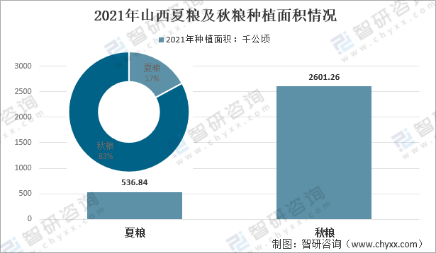 2021年山西省夏糧播種面積為536.84千公頃,占17%,扭轉了連續11年下滑勢頭;秋糧種植面積2601.26千公頃,占83%。
