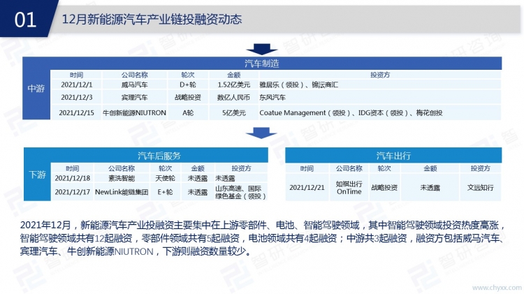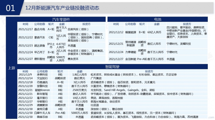 在政策鼓勵(lì)、技術(shù)能力提升、基礎(chǔ)設(shè)施完善、汽車增換購(gòu)需求提升等因素推動(dòng)下,新能源汽車行業(yè)發(fā)展迅速。從政策來(lái)看,2021年12月,工業(yè)和信息化部、國(guó)務(wù)院等相關(guān)部委發(fā)布多項(xiàng)新能源汽車推廣政策,12月31日,財(cái)政部、工業(yè)和信息化部 、科技部、發(fā)展改革委發(fā)布了《關(guān)于2022年新能源汽車推廣應(yīng)用財(cái)政補(bǔ)貼政策的通知》,明確了2022年新能源汽車補(bǔ)貼方案。從產(chǎn)業(yè)動(dòng)態(tài)來(lái)看,新能源汽車動(dòng)力電池領(lǐng)域頻繁“亮劍”,寧德時(shí)代、中科電氣等企業(yè)紛紛投資設(shè)廠,擴(kuò)張產(chǎn)能。從產(chǎn)業(yè)鏈來(lái)看,上游領(lǐng)域尤其是智能駕駛領(lǐng)域投資熱度高漲,中游共有3起融資,融資方包括威馬汽車、賓理汽車、牛創(chuàng)新能源NIUTRON。