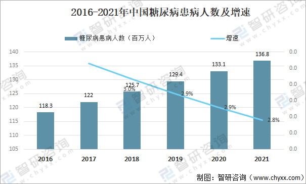 中國糖尿病患病人數(shù)逐年增加,其中2021年中國糖尿病患病人數(shù)約為136.8百萬人,同比增長2.8%。