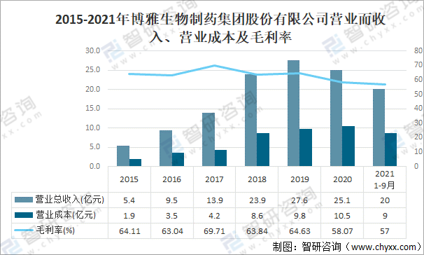 2015-2021年博雅生物制藥集團股份有限公司營業(yè)而收入、營業(yè)成本及毛利率