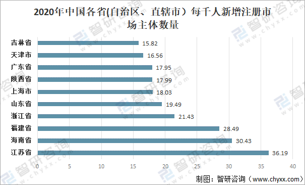 2020年,江蘇省每千人新增市場主體數量達到36.19戶,排名全國第一;海南省每千人新增市場主體數量30.43戶,排名第二;福建省每千人新增市場主體數量28.49戶,排名第三;浙江省、山東省每千人新增市場主體數量21.43戶、19.49戶,排名第四、第五。