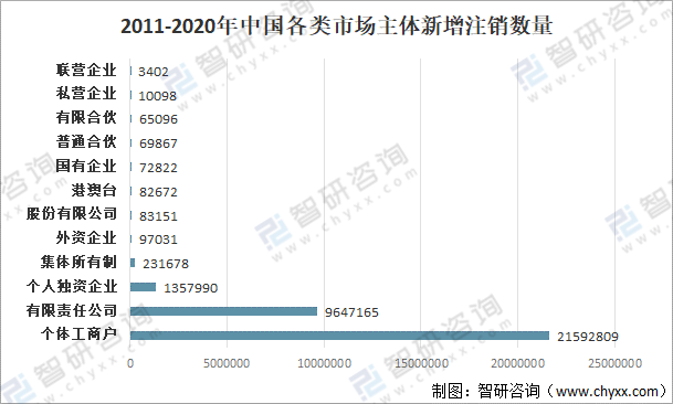 近十年來增長最多的市場主體類型分別是個體工商戶、有限責任公司和個人獨資企業。2011-2020年中國共新增注冊個體工商戶79021003戶,占新增市場主體的67.45%;其次有限責任公司共新增了34039938戶,占到新增市場主體的29.06%;個人獨資企業共新增了2733740戶,占新增市場主體的2.33%。