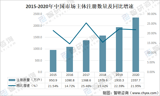 2015-2020年中國市場主體注冊數量及同比增速