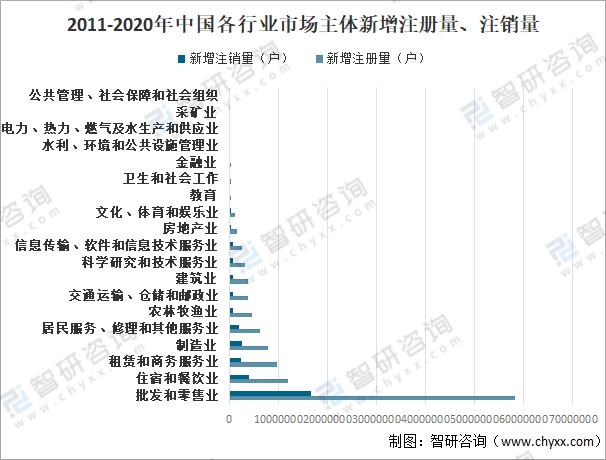 2011-2020年中國各行業市場主體新增注冊量、注銷量