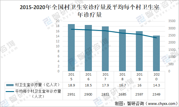 2020年,全國村衛生室診療量達14.3億人次,比上年減少1.7億人次,同比下降10.63%;平均每個村衛生室年診療量2349人次,比上年減少248人次,同比下降9.55%。