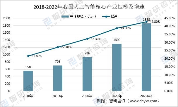 2018-2022年我國人工智能核心產業規模及增速