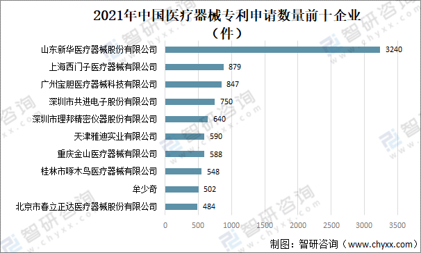 其中2021年山東新華醫療器械股份有限公司專利申請數量為3240件;上海西門子醫療器械有限公司專利申請數量為879件;廣州寶膽醫療器械科技有限公司專利申請數量為847件;深圳市共進電子股份有限公司專利申請數量為750件。