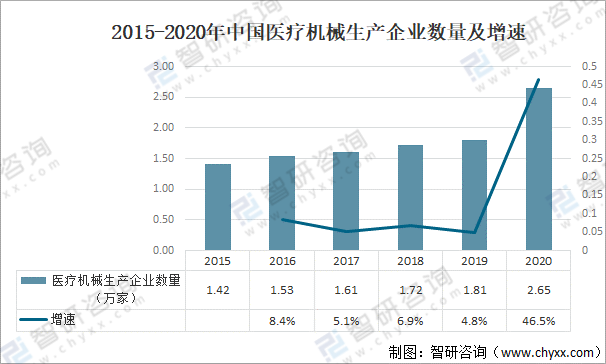 國內醫療器械已經成為一個創新力強、產品品類齊全、市場需求旺盛。醫療機械生產企業數量逐年增加,其中2020年中國醫療機構生產企業數量為2.65萬家,同比增長46.5%。
