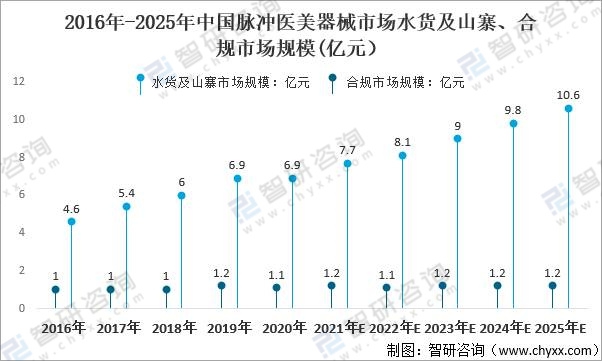2016年-2025年中國脈沖醫美器械市場水貨及山寨、合規市場規模
