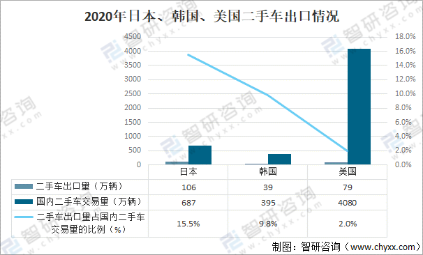 二手車出口主要集中在日美韓等發(fā)達國家。2020年,日本二手車出口量106萬輛,占國內(nèi)交易量的 15.5%;韓國二手車出口量39萬輛,占國內(nèi)交易量的9.8%;美國二手車出口量79萬輛,占國內(nèi)交易量的2%。