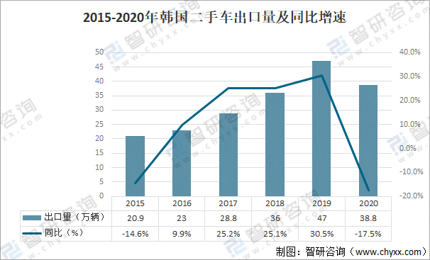 2015-2020年韓國二手車出口量及同比增速