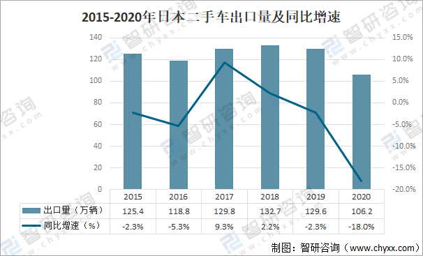 2015-2020年日本二手車出口量及同比增速