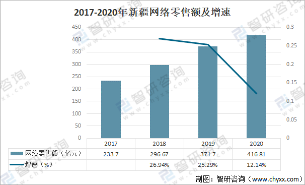 2017-2020年新疆網(wǎng)絡(luò)零售額及增速