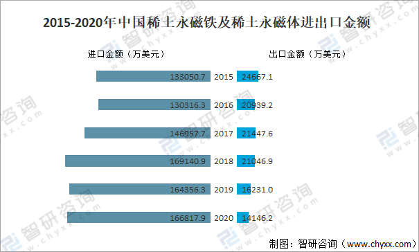 據中國海關數據,2020年中國稀土永磁鐵及稀土永磁體進口金額為166817.9萬美元,同比增長1.5%;稀土永磁鐵及稀土永磁體出口金為14146.2萬美元,同比下降12.8%。