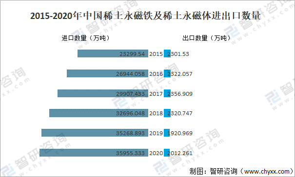我國進口數量整體較多,其中2020年中國稀土永磁鐵及稀土永磁體進口數量為35955.3萬噸,同比增長1.9%;稀土永磁鐵及稀土永磁體出口數量為2012.3萬噸,同比增長4.8%。